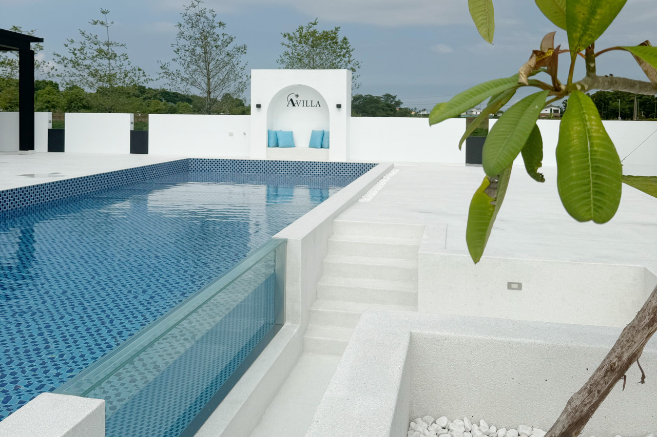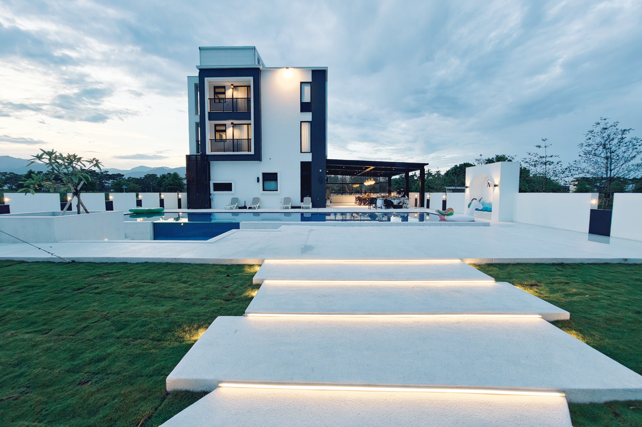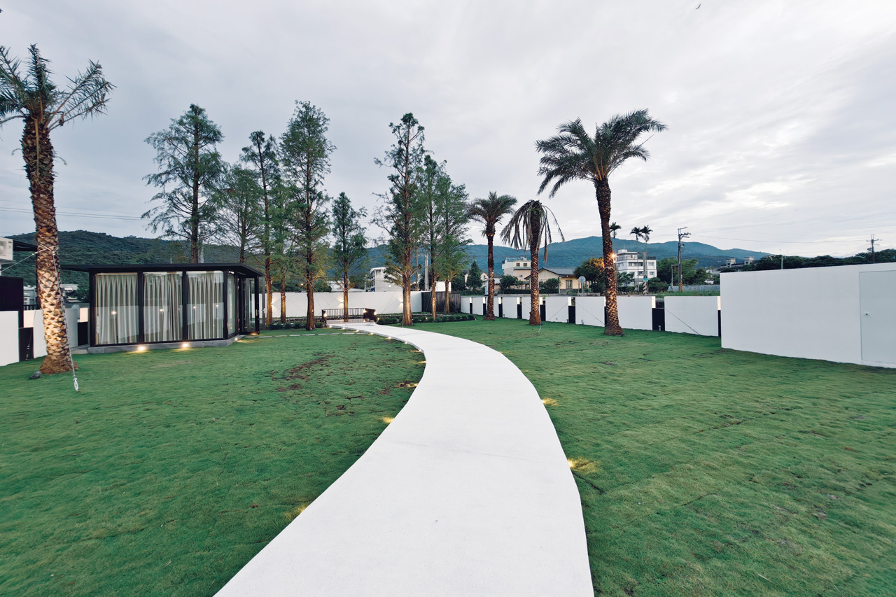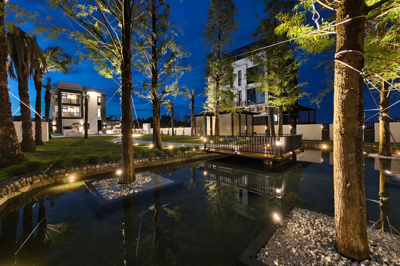 棕櫚樹下沉式沙發區、陽傘躺椅